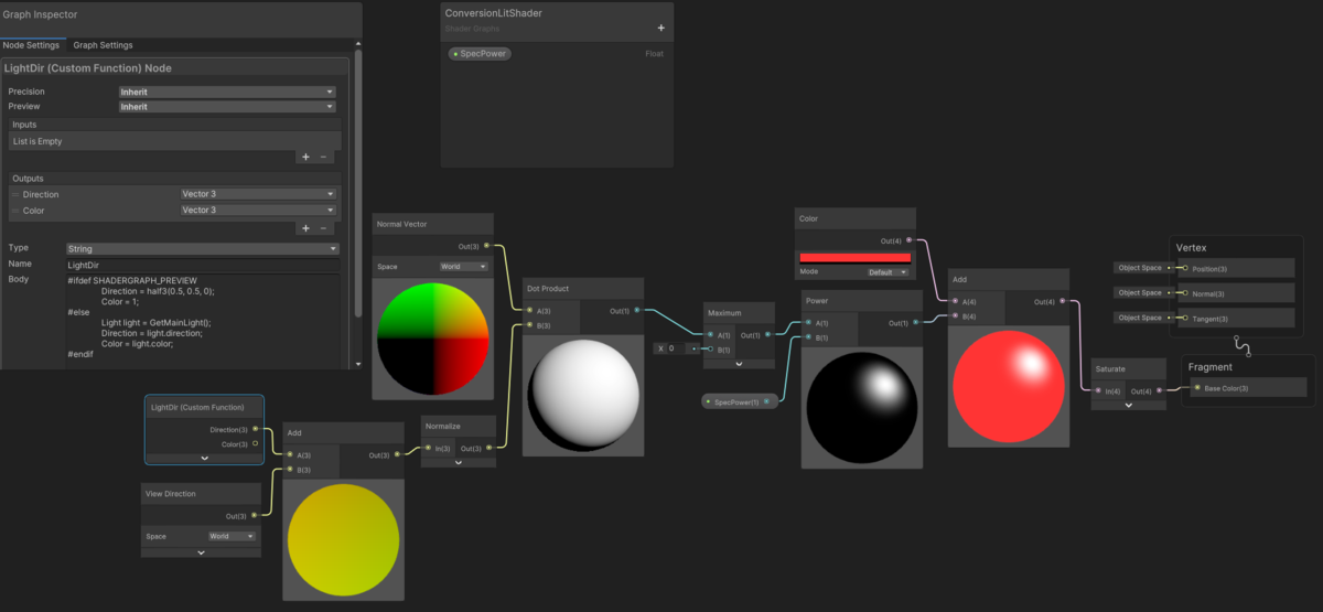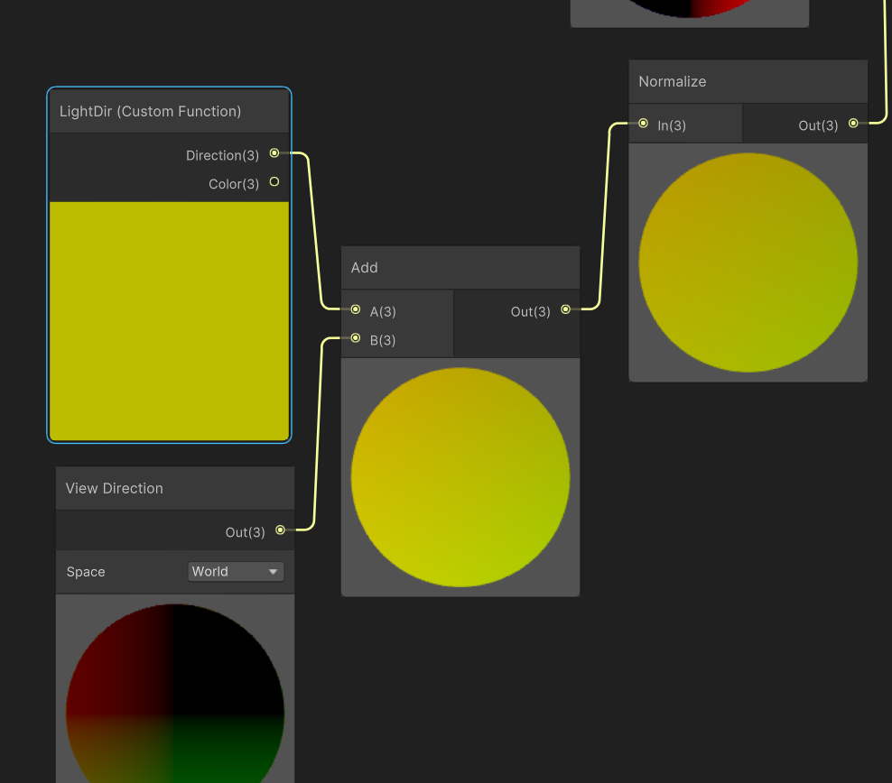 #ifdef SHADERGRAPH_PREVIEW Direction = half3(0.5, 0.5, 0); Color = 1; #else Light light = GetMainLight(); Direction = light.direction; Color = light.color; #endif